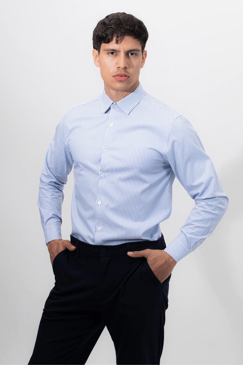 Vibe "Wall Street" Moderna: A camisa listrada azul é um símbolo de sucesso corporativo. Ela transmite uma imagem mais dinâmica e ativa do que a camisa azul lisa tradicional.